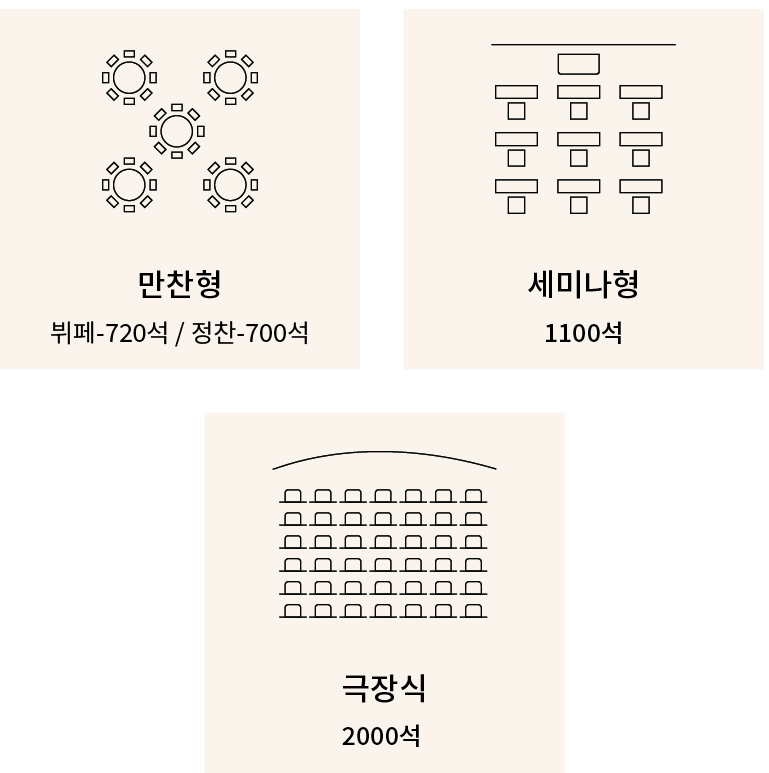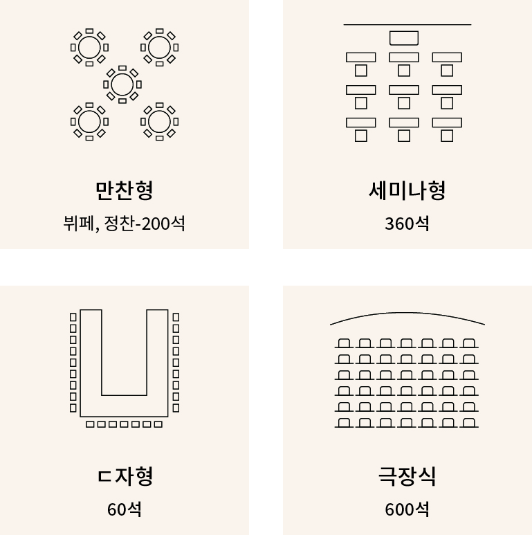 국제 수준의 학술대회 등 대규모 행사를 위한 첨단기자재와 5개국 통역 서비스를 제공하는 연회장은 결혼식, 칵테일 파티, 리셉션 등 다양한 모임의 성격과 규모에 맞춰 성공적인 연회를 연출해 드립니다.